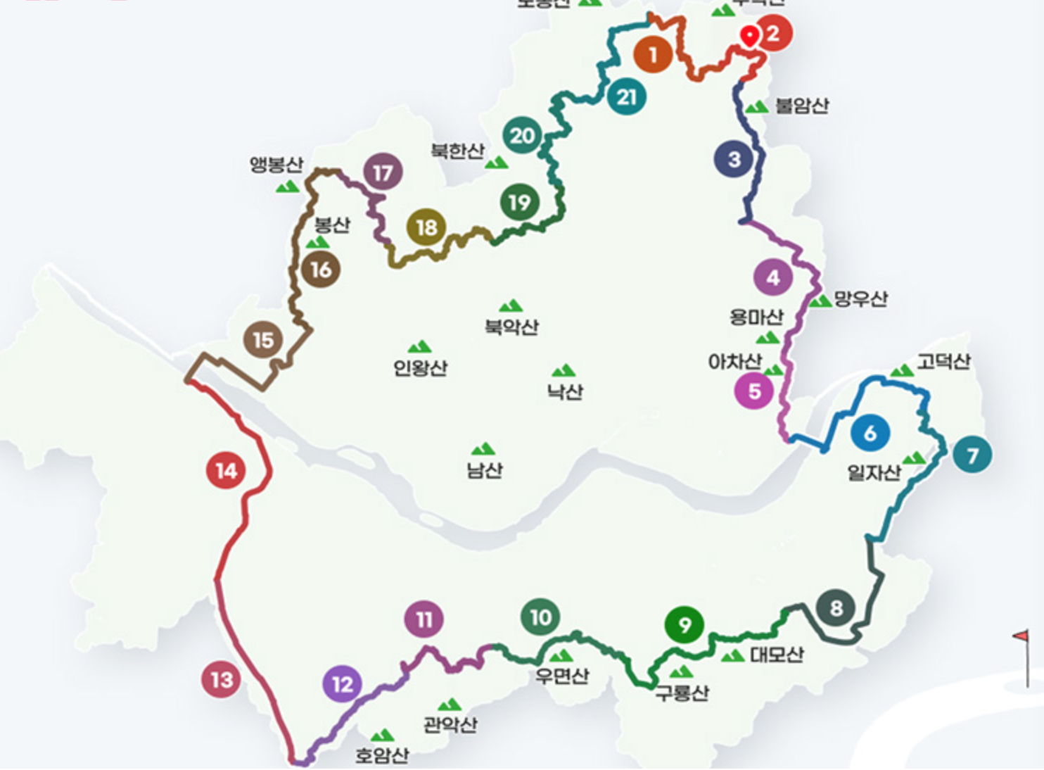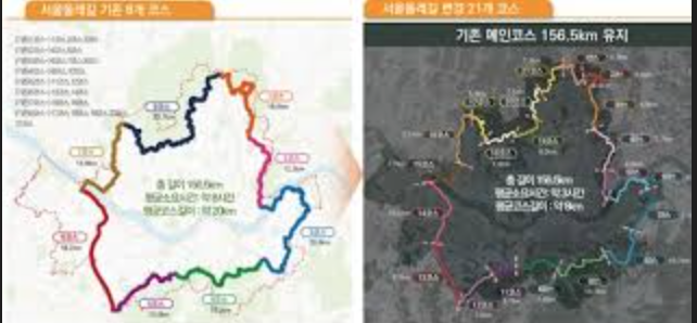 대표적으로 북한산, 관악산, 불암산, 수락산 등 서울 외곽 산지를 따라 이어지는 코스가 많으며 중간중간 하천길과 마을길이 함께 연결됩니다.